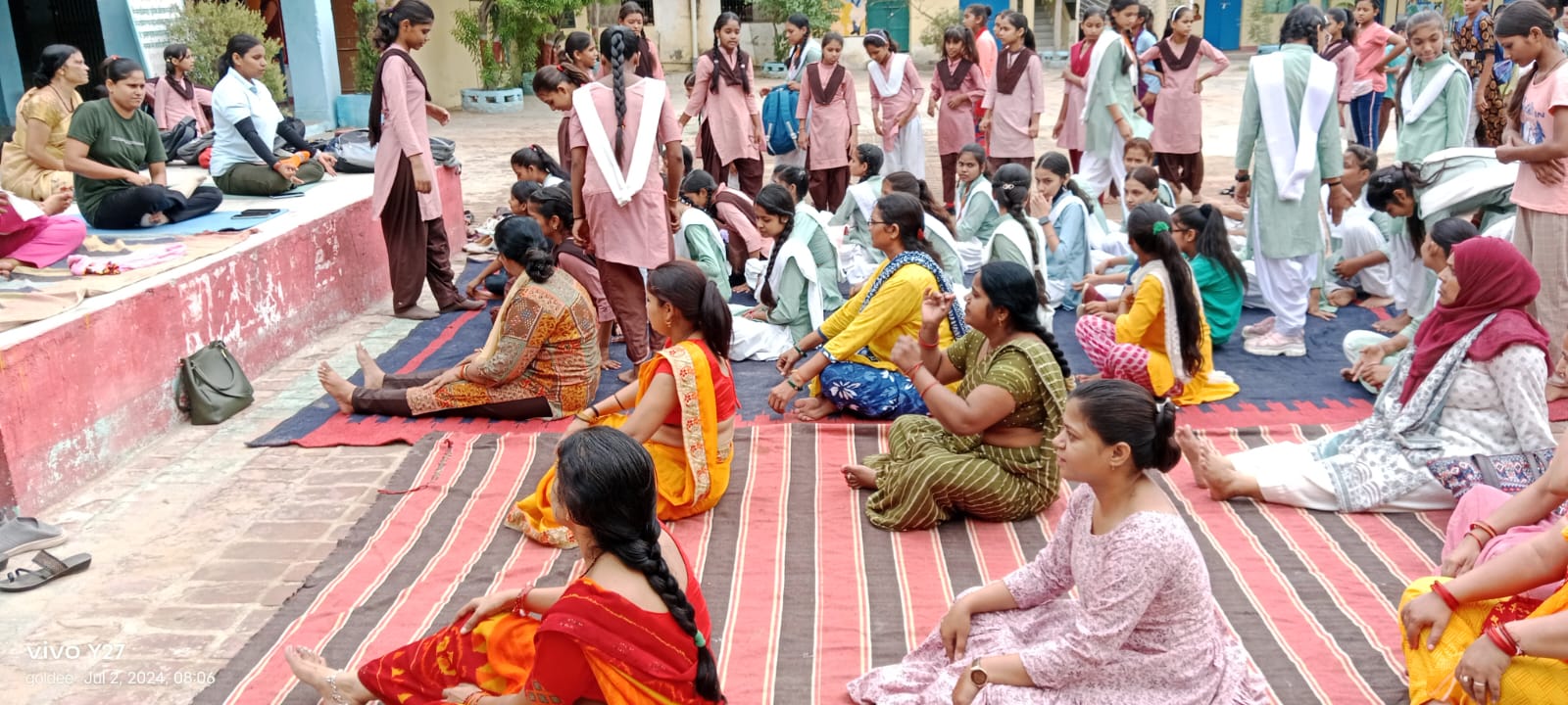 योग प्रदर्शन करते पीएम श्री जीजीआईसी महोबा की शिक्षिकाए प्रधानाचार्य सरगम खरे एवम प्यारे बच्चे